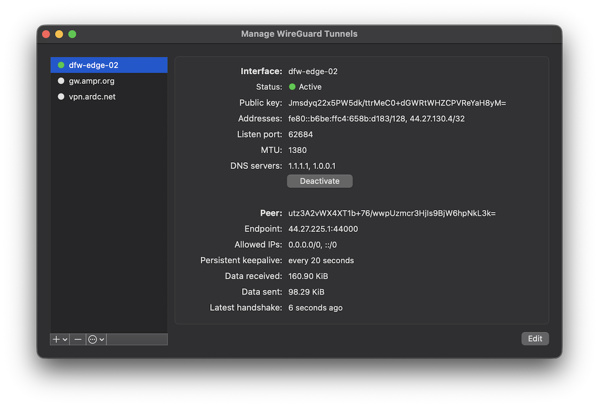 current02:22, 24 February 2026Thumbnail for version as of 02:22, 24 February 20261,200 × 816 (310 KB)KI5QKX (talk | contribs)A screenshot of the WireGuard client for macOS with the Manage Tunnels window open, with a Connect tunnel freshly activated